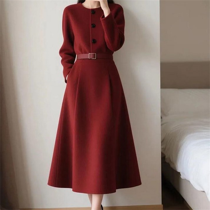 AOKADA 여성 봄 가을 라운드넥 허리 벨트 A라인 플레어 원피스 결혼식 하객룩