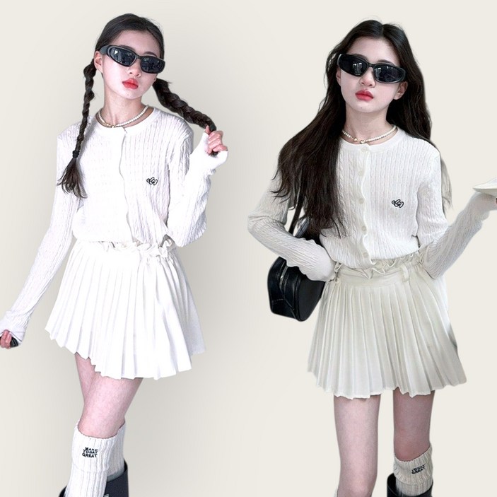 해피팡팡 봄 가을 아동 주니어 꽈배기 가디건 플리츠스커트 투피스 세트 화이트코코 트윈셋 140170호 초중생 가을 투피스 추석 설날 여아 상하의세트 여아상하복세