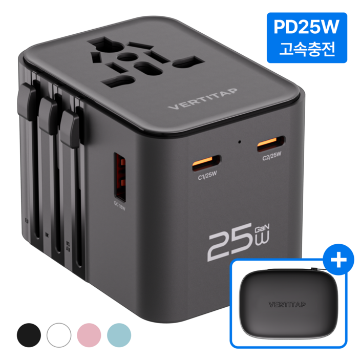 버티탭 트레블러 에어 PD 25W 멀티 어댑터 해외 전세계 여행용 멀티탭 usb 콘센트 플러그 돼지코 일본 베트남 중국 홍콩 태국 대만 필리핀 미국 유럽, 1개, 블랙