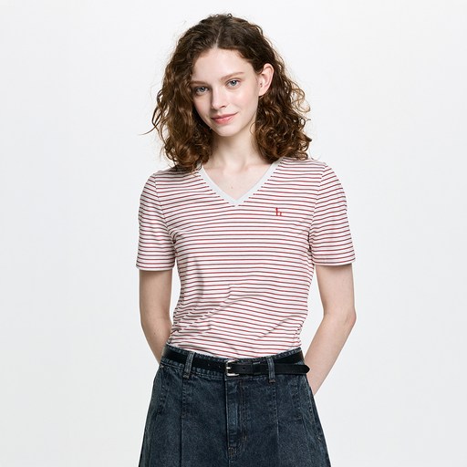 헤지스 여성용 아이코닉 브이넥 코튼모달 스트라이프 반팔 티셔츠