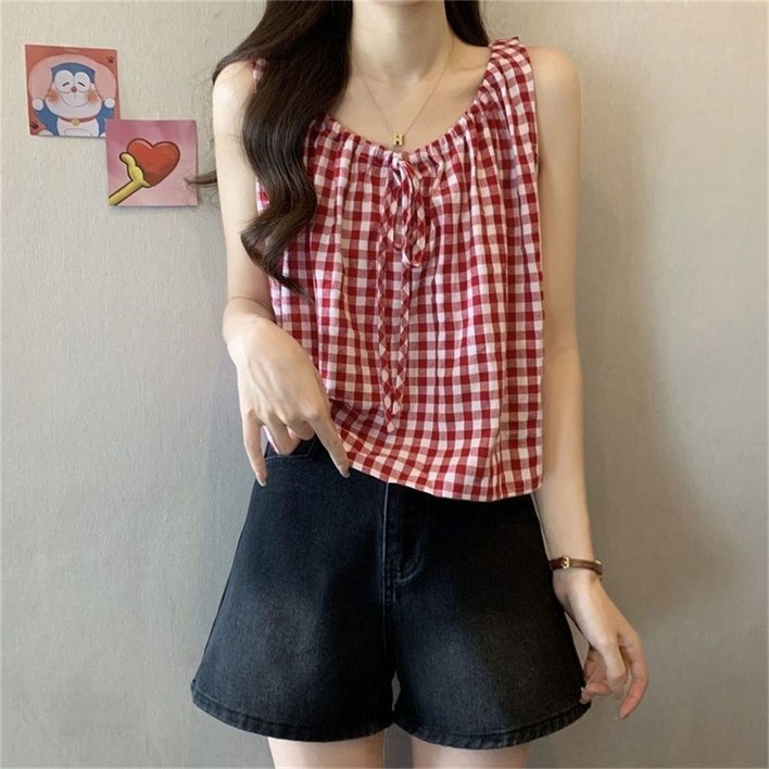 TKX 여성 슬리브리스 블라우스 루즈핏 캐주얼 나시 탑 데일리 심플 체크무늬 민소매 상의