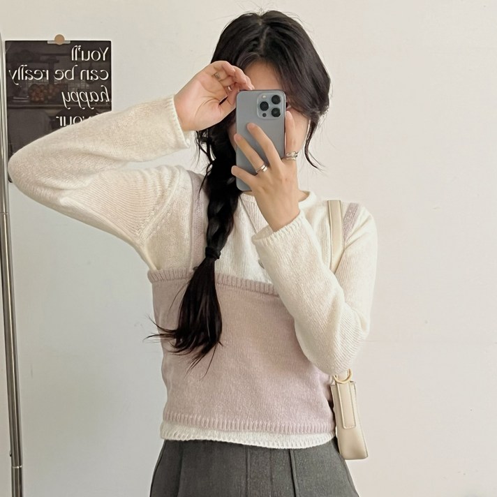 세컨핑크 여성용 레이어드 뷔스티에 울혼방 니트 나시 긴팔 세트 502